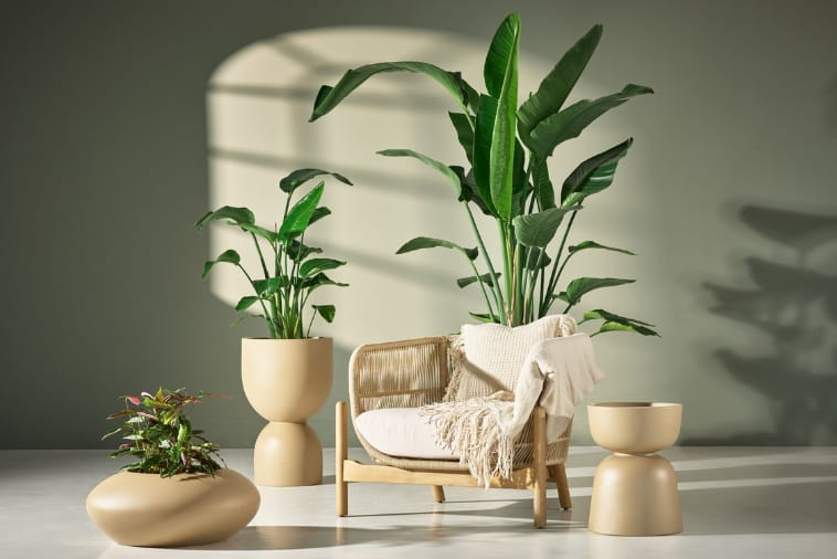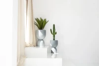Minimalistyczny szyk: Geometryczna sylwetka w nowoczesnym otoczeniu tworzy efektowny kontrast z zielenią i kwiatami, uwydatniając ich naturalne barwy.