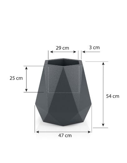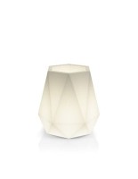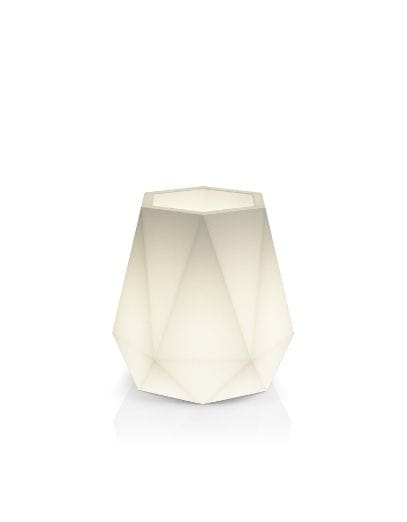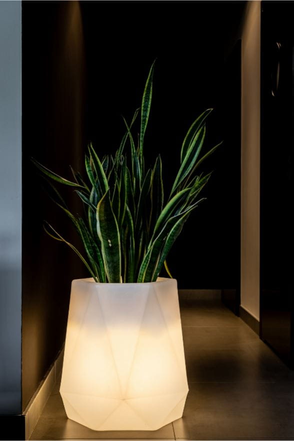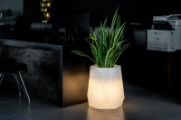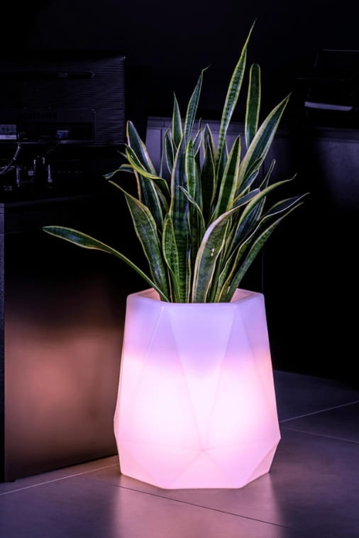 Donica Geometryczna Flavi w wersji podświetlanej to nie tylko nowatorska ozdoba, delikatne światło wprowadzi przyjemny nastrój wieczorową porą, gdziekolwiek zdecydujesz się ją postawić, zyskując gustowną lampę.