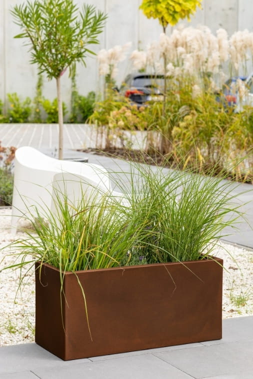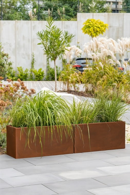 W donicach takich jak Long Midi efekt rdzawienia uzyskuje się dzięki specjalnym materiałom, jak polietylen (tworzywo sztuczne) w kolorze corten efekt, co daje nam wizualny efekt stali cortenowej, ale bez potrzeby czekania na proces rdzewienia. To doskonała alternatywa dla osób, które cenią wygląd stali cortenowej, ale chcą cieszyć się tym efektem od razu, bez czekania na naturalny proces starzenia się materiału.
