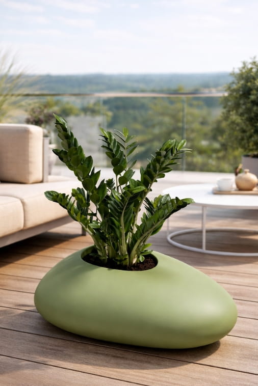 Choć donica Stoner M wygląda jak naturalny kamień, w rzeczywistości jest znacznie lżejsza – nawet duże modele można z łatwością przenieść jedną ręką. Dzięki temu łączy w sobie wygląd surowej natury z wygodą nowoczesnych materiałów, a jej oliwkowy kolor nawiązuje do barw śródziemnomorskiej roślinności, kojarząc się z harmonią, spokojem i ekologicznym stylem życia.