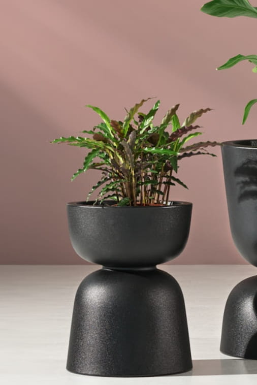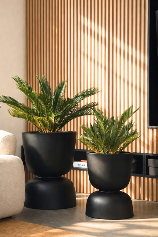 Dwustronna konstrukcja czarnej donicy Reverso 45 została zainspirowana zasadami projektowania rzeźbiarskiego, w których forma zmienia swój charakter w zależności od punktu widzenia. Dzięki temu jeden produkt może pełnić kilka różnych ról aranżacyjnych — wystarczy go obrócić, aby całkowicie odmienić proporcje kompozycji roślinnej i sposób jej odbioru w przestrzeni. To rozwiązanie szczególnie cenione przez architektów i projektantów wnętrz, którzy traktują donicę nie tylko jako funkcjonalny pojemnik na rośliny, ale jako element świadomie kształtujący rytm i dynamikę całej aranżacji.