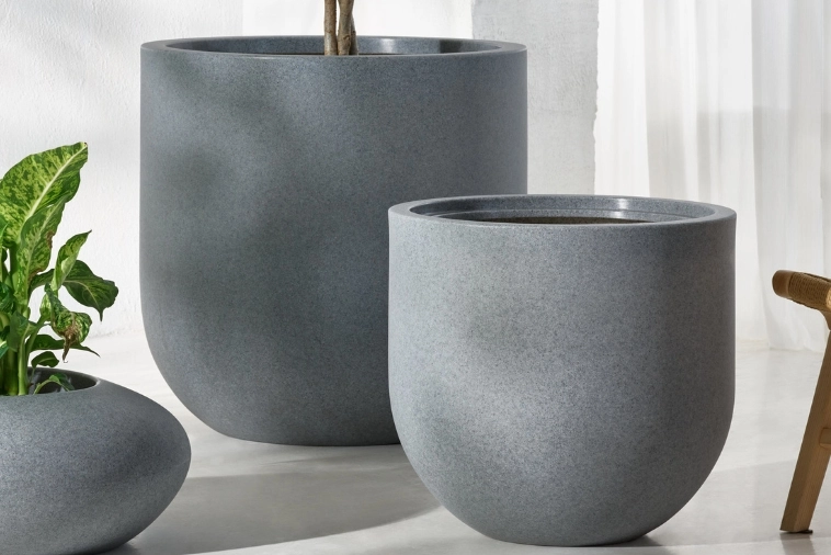 Szaro-mineralna tonacja i minimalistyczna forma tworzą subtelne, ale charakterystyczne tło dla większych roślin – od oliwek i cyprysów po iglaki i formowane bukszpany. Primo 70 nie dominuje – współgra. Nie przytłacza – uwydatnia. Jest ramą, która pozwala zieleni mówić własnym językiem.