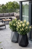 Duża geometryczna donica Flavi sprawdzi się zarówno w prostych wnętrzach jak i bogatych w roślinność tarasach i ogrodach.