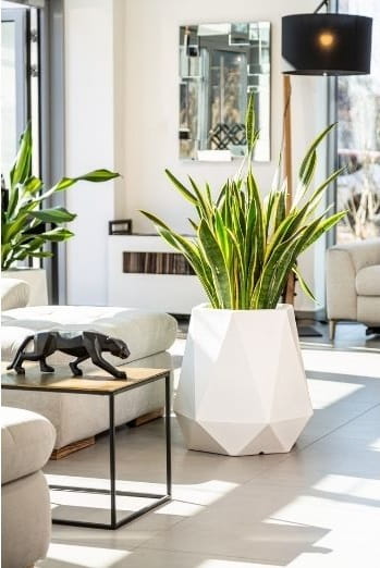 Duże geometryczne donice Flavi są stworzone do eksponowania wysokich kwiatów takich jak Sansevieria gwinejska, juka, fikus czy zamiokulkas.