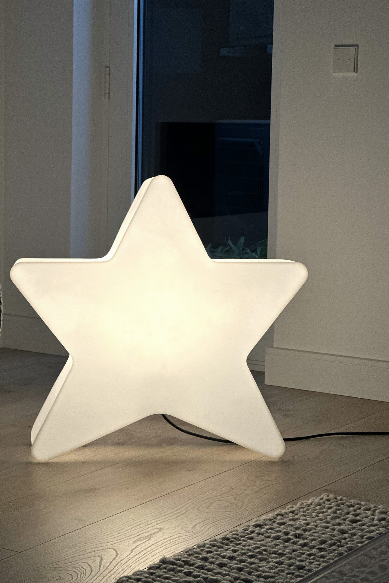 Elegancka dekoracja świetlna w formie gwiazdy wyposażona jest w biały przewód przyłączeniowy, subtelnie komponujący się z jasnym tłem i ograniczający wizualny „szum” w przestrzeni. Przewód przeznaczony jest wyłącznie do użytku wewnętrznego, ze względu na brak dodatkowej izolacji.