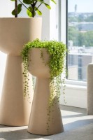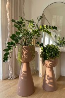 Zendo 65 to ozdobna donica o wysokości 65 cm, zaprojektowana w duchu nowoczesnej architektury. Jej minimalistyczna, geometryczna bryła opiera się na czystych liniach i dopracowanych proporcjach. Szeroka, łagodnie zaokrąglona misa płynnie przechodzi w stabilną, stożkową podstawę, tworząc spójną, rzeźbiarską całość o wyrazistym, a jednocześnie ponadczasowym charakterze.