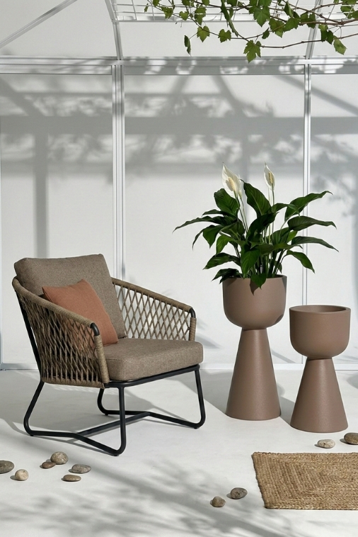 Matowy beż ociepla przestrzeń i tworzy subtelne, naturalne tło dla roślin. Zieleń liści, ozdobne trawy, formowane krzewy czy egzotyczne palmy zyskują w jego otoczeniu głębię i wyrazistość. Stonowany kolor podkreśla faktury i wprowadza do aranżacji spokój oraz elegancję.