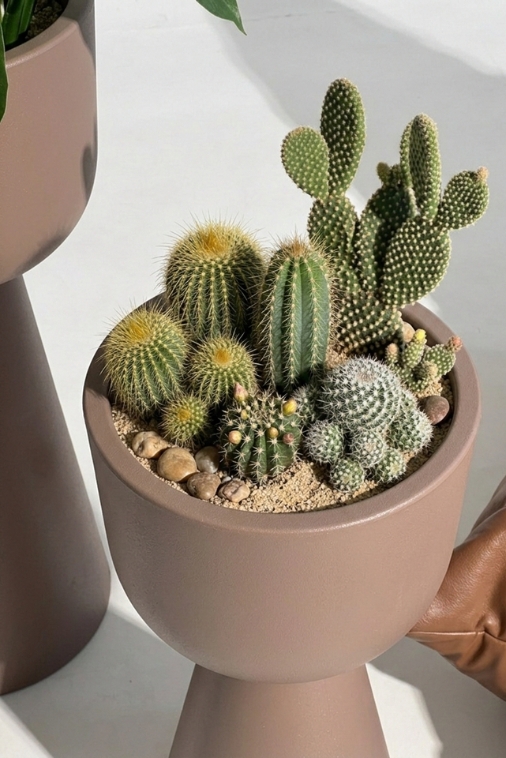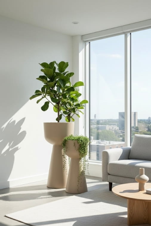 Beżowe donice, takie jak Zendo 65, są szczególnie cenione przez architektów wnętrz, ponieważ nie odbijają światła tak intensywnie jak biel – dzięki temu rośliny wyglądają w nich bardziej naturalnie, a cała aranżacja zyskuje spokojniejszy, bardziej harmonijny charakter.