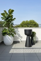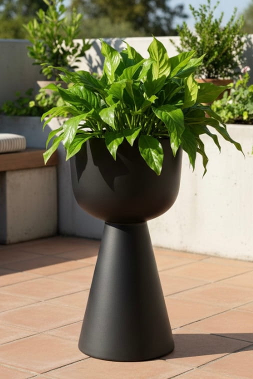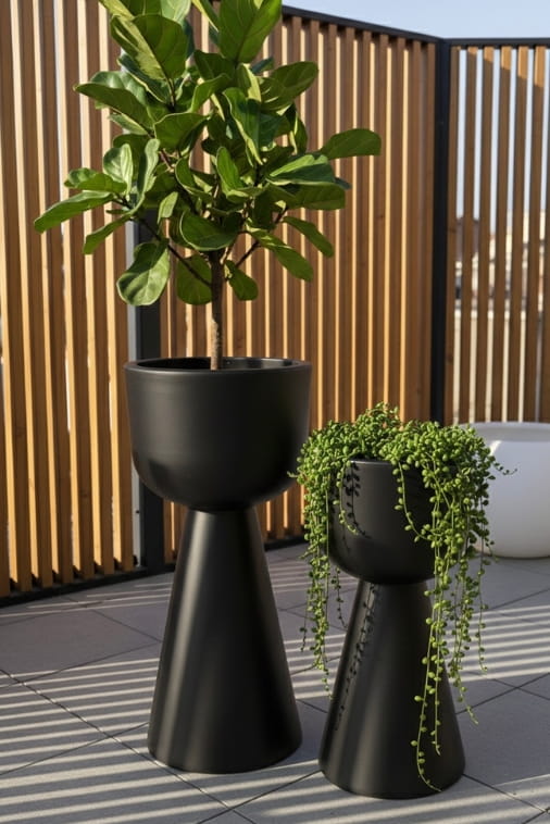 Minimalistyczna forma i głęboka, matowa czerń sprawiają, że donica staje się doskonałym tłem dla roślin. Intensywna zieleń liści, delikatne trawy ozdobne, formowane krzewy czy egzotyczne palmy zyskują w jej towarzystwie jeszcze większą wyrazistość.
