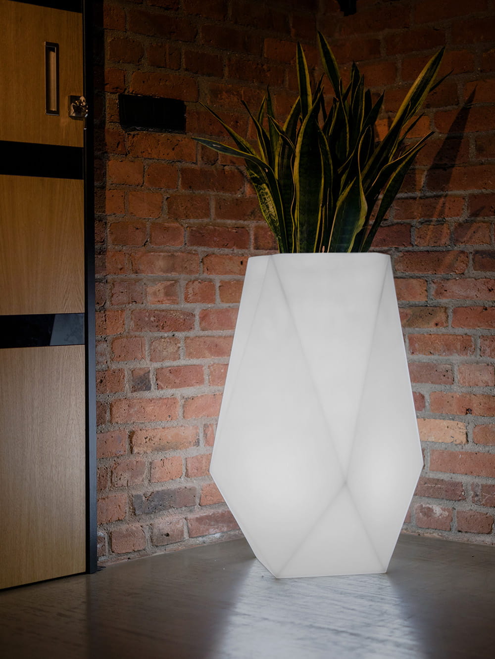 Ostre, nowoczesne linie donicy Volcano zdecydowanie przypadną do gustu osobom szukającym nowoczesnych, stylowych kształtów chcącym udekorować w sposób nietuzinkowy swój dom ogród czy taras. Stylowa donica Volcano wpisuje się w trend donic o geometrycznych. nowoczesnych kształtach. Proste, a jednocześnie ostre i designerskie kształty donicy Volcano spowodują, że wybiorą ja najbardziej wymagający odbiorcy. Donica Volcano ozdobi biuro, restauracje a także przedsionek sklepu. Wersja podświetlana donicy Volcano rozświetli Wasze wnętrze domu lub umili wieczór na tarasie pełniąc funkcję lampy.