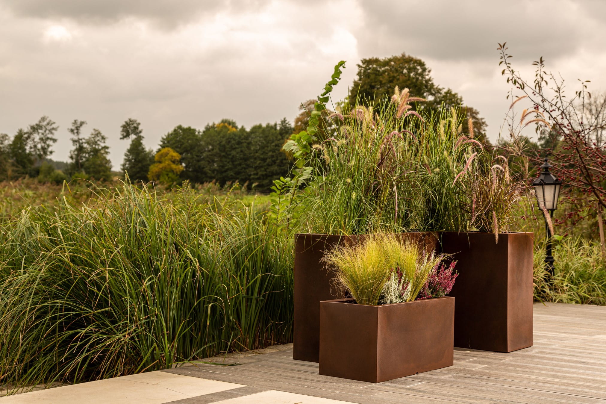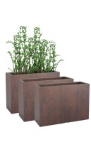 Zestaw 3 donic prostokątnych 100 cm w efekcie cortenu na taras | Longerino z półką | Monumo