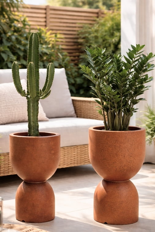 Efekt stalowej rdzy (imitacja kortenu) zmienia swój odbiór w zależności od światła. W pełnym słońcu podkreśla metaliczne refleksy i ciepłe rdzawe tony, a w cieniu nabiera głębi i surowego, industrialnego charakteru. Dzięki temu donice wyglądają inaczej o każdej porze dnia, tworząc dynamiczny element aranżacji.
